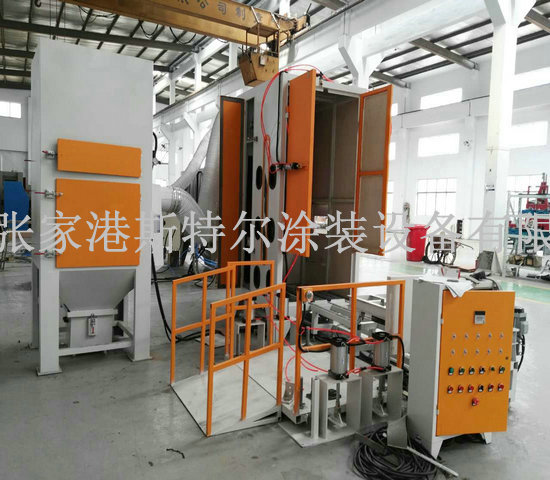 本套設備主要由主機、輸送小車、噴砂系統、回砂系統、除塵系統、裝卸升降平臺、電氣控制系統、空氣壓縮機(用戶自備)等組成。
